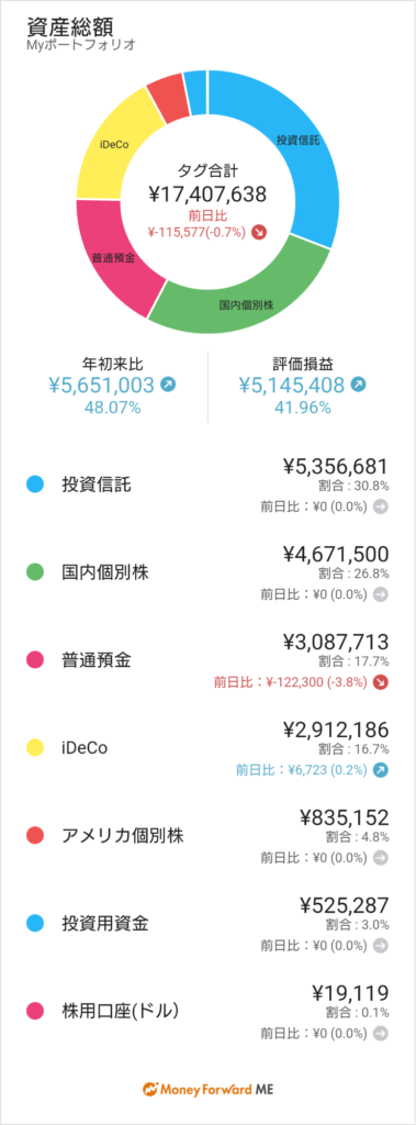 急に個別株買ってみたり余計な事してますがやはり投資信託とiDeCoが大きいかと。